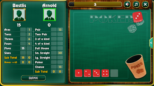 Hai đôi xuất hiện khi có hai cặp giá trị giống nhau trong 5 viên xúc xắc. Bộ ba là khi có ba viên xúc xắc cùng giá trị. Sảnh là trường hợp các viên xúc xắc tạo thành chuỗi liên tiếp theo thứ tự.