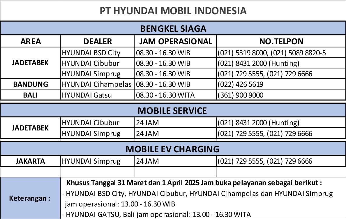 Selama libur Lebaran 28 Maret hingga 7 April 2025, PT Hyundai Mobil Indonesia berkomitmen untuk tetap memberikan layanan terbaik kepada pelanggan, sebagai bentuk kepedulian terhadap kenyamanan dan keamanan selama persiapan, perjalanan dan kepulangan mudik.
