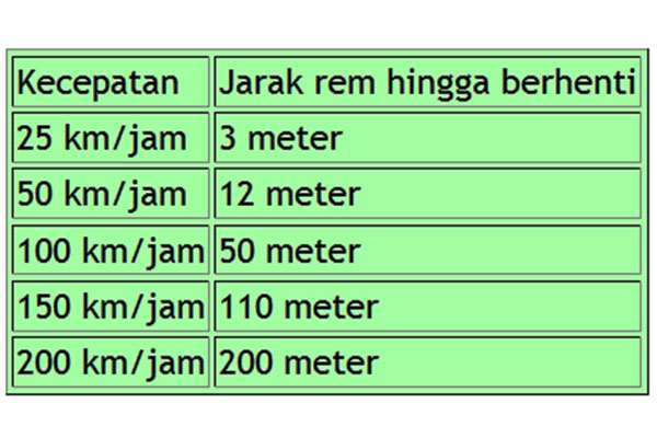 Maka jika berkendara dalam kecepatan 100 km/jam, hampir 60 meter kendaraan masih melaju bebas ke depan. Jika jarak dengan mobil di depan sangat dekat, akan sulit untuk terhindari dari benturan.